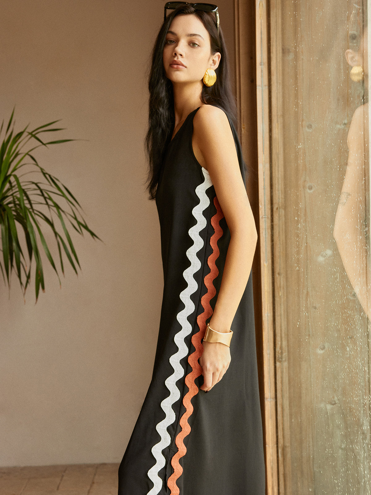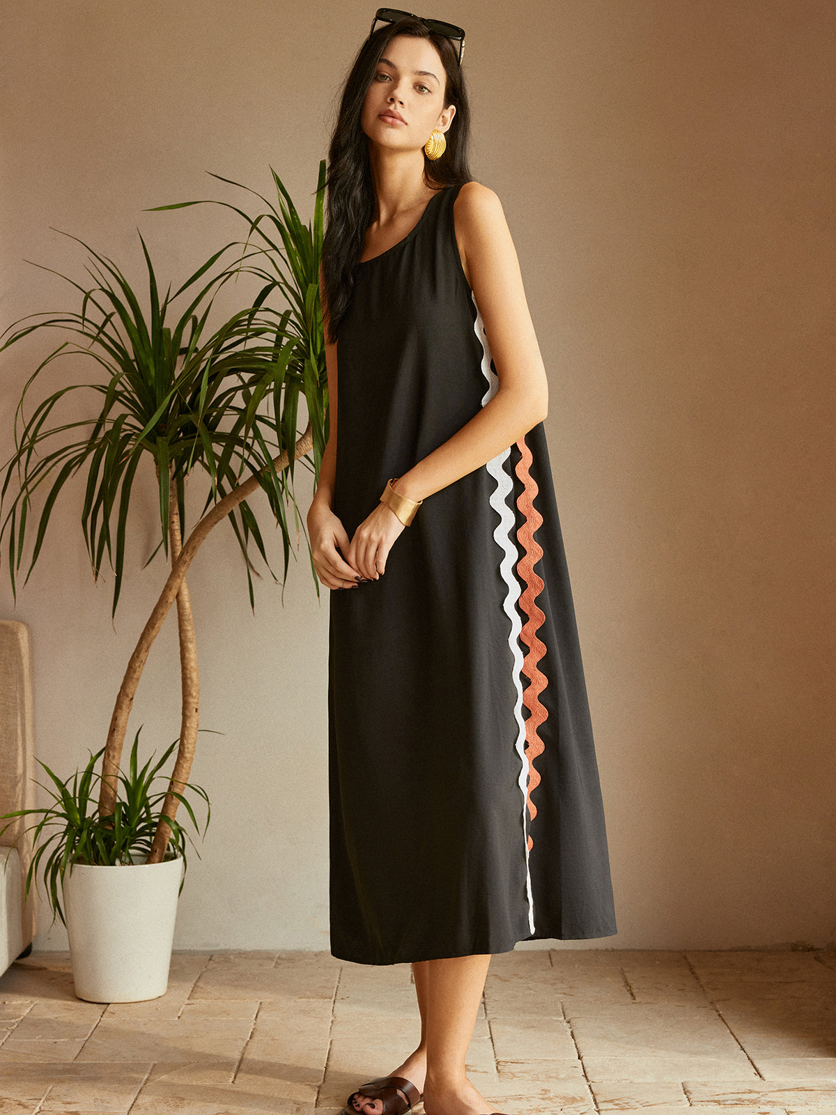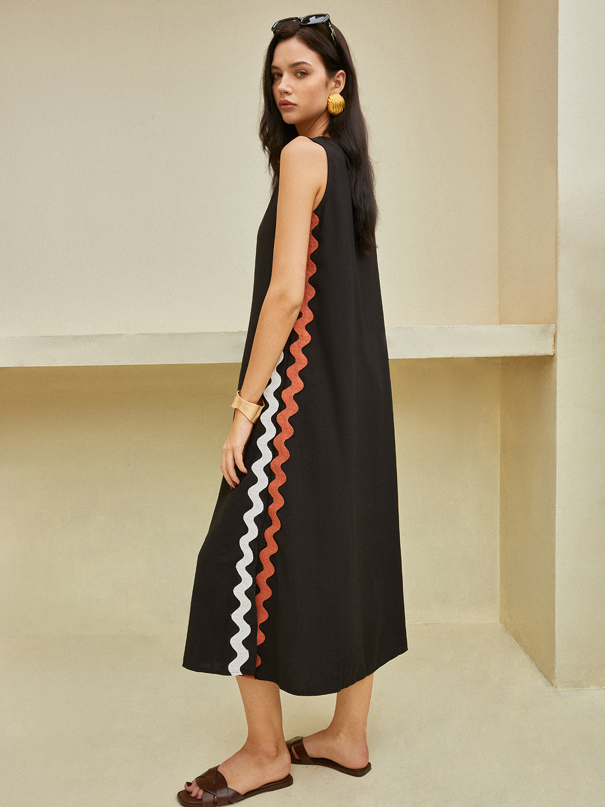 Kontrast Süslemeli Yırtmaçlı Kolsuz Elbise