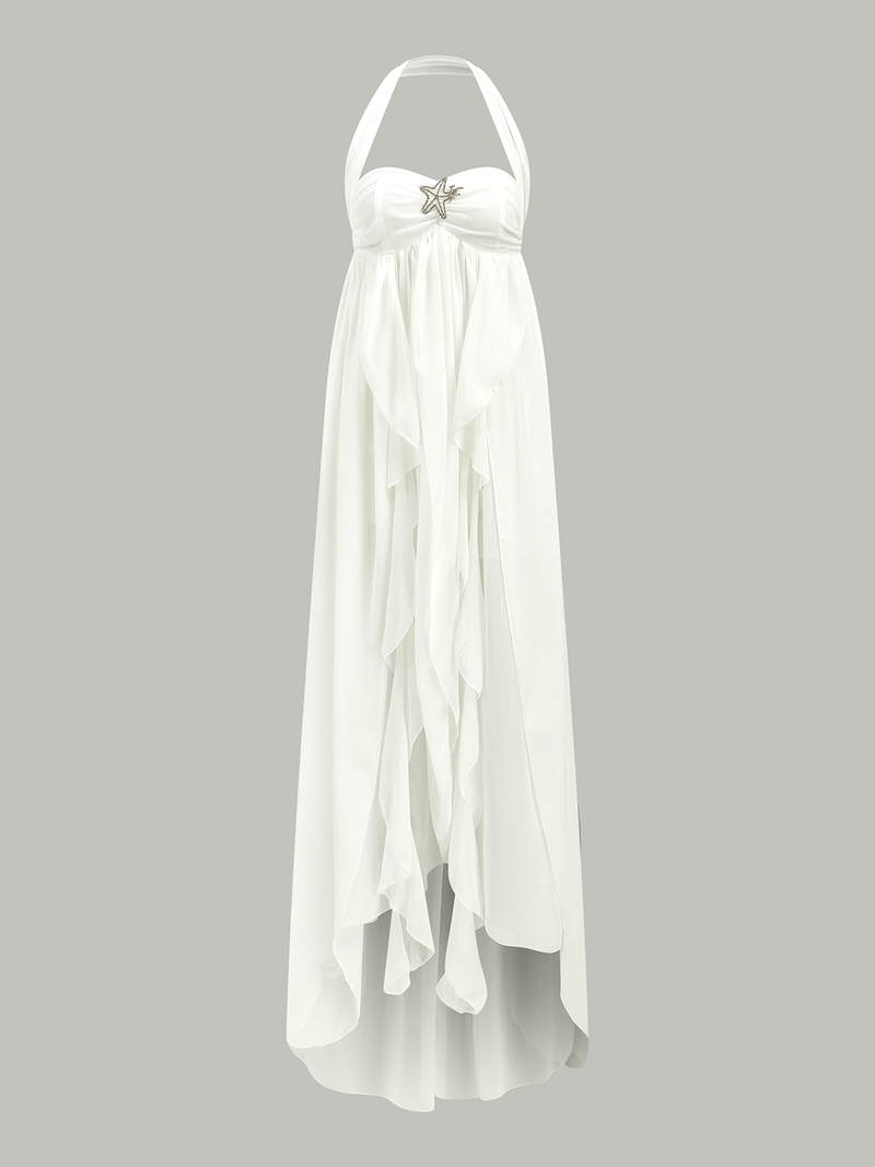 Modern Tasarım: Şık halter yaka, sırt dekoltesi ve zarif fırfırlı pileleriyle bu elbise, özel günler için mükemmel bir seçim.