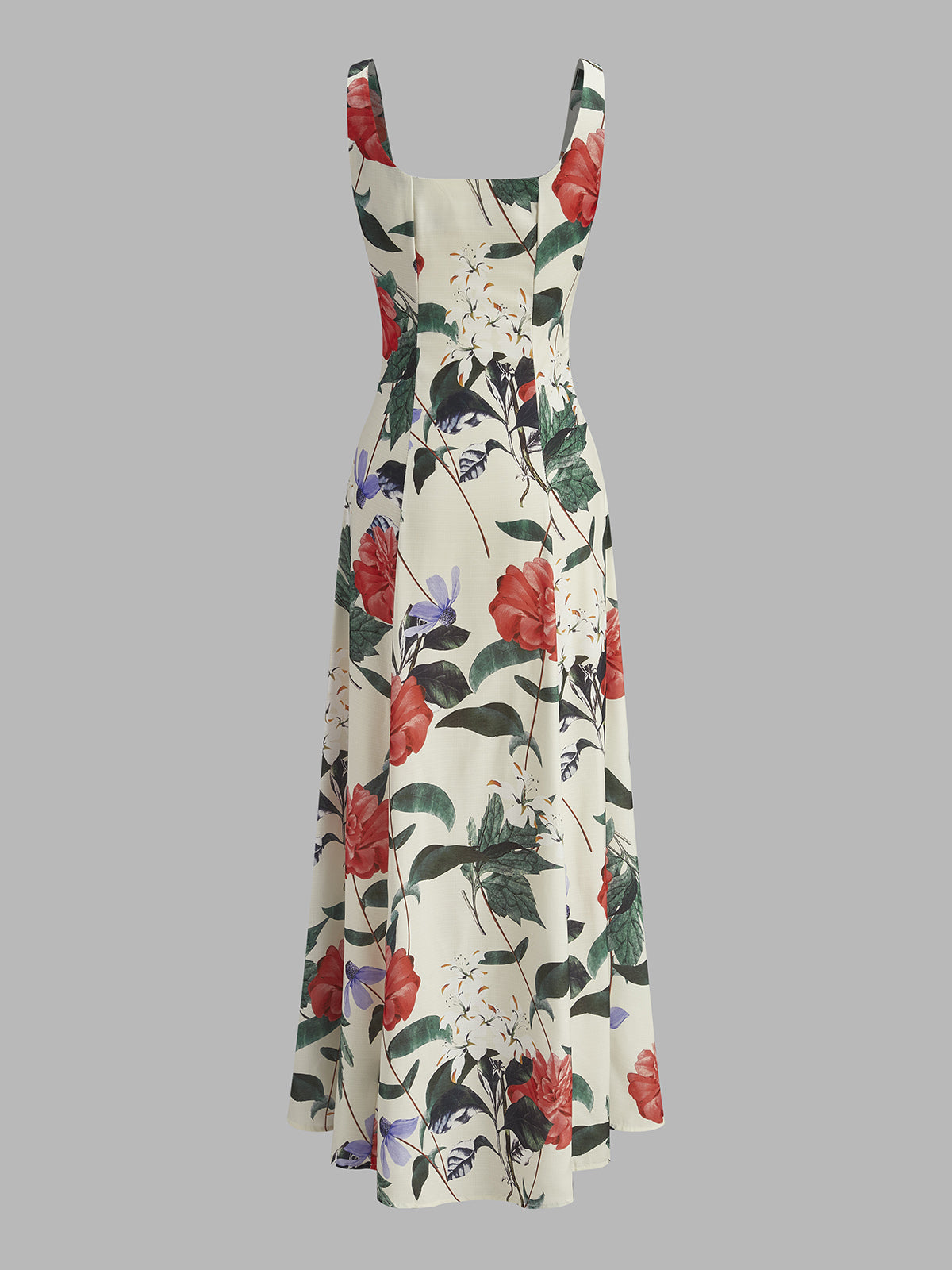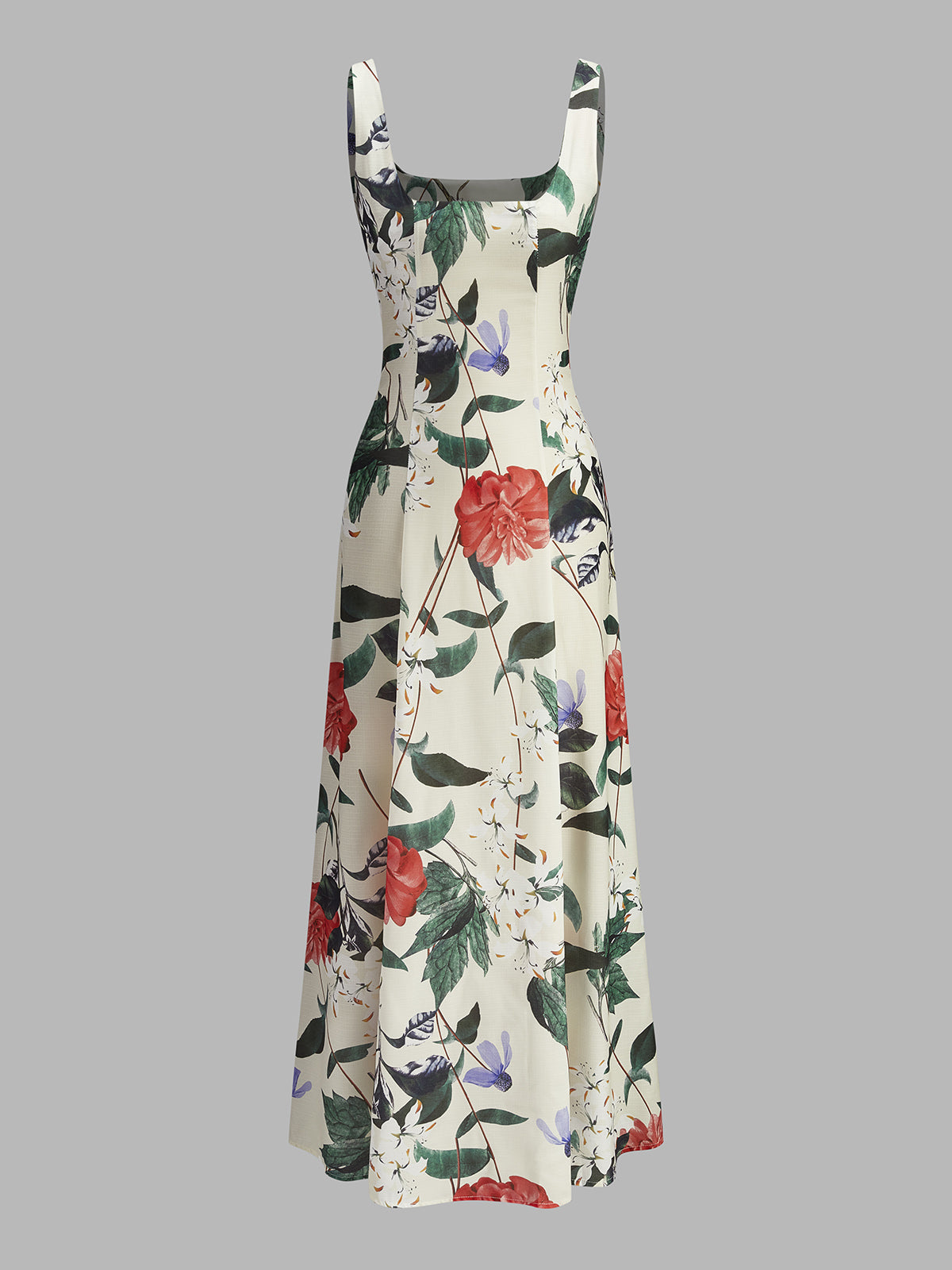 Çiçek Desenli Kısa Kol Fermuarlı Elbise, Kare Yaka