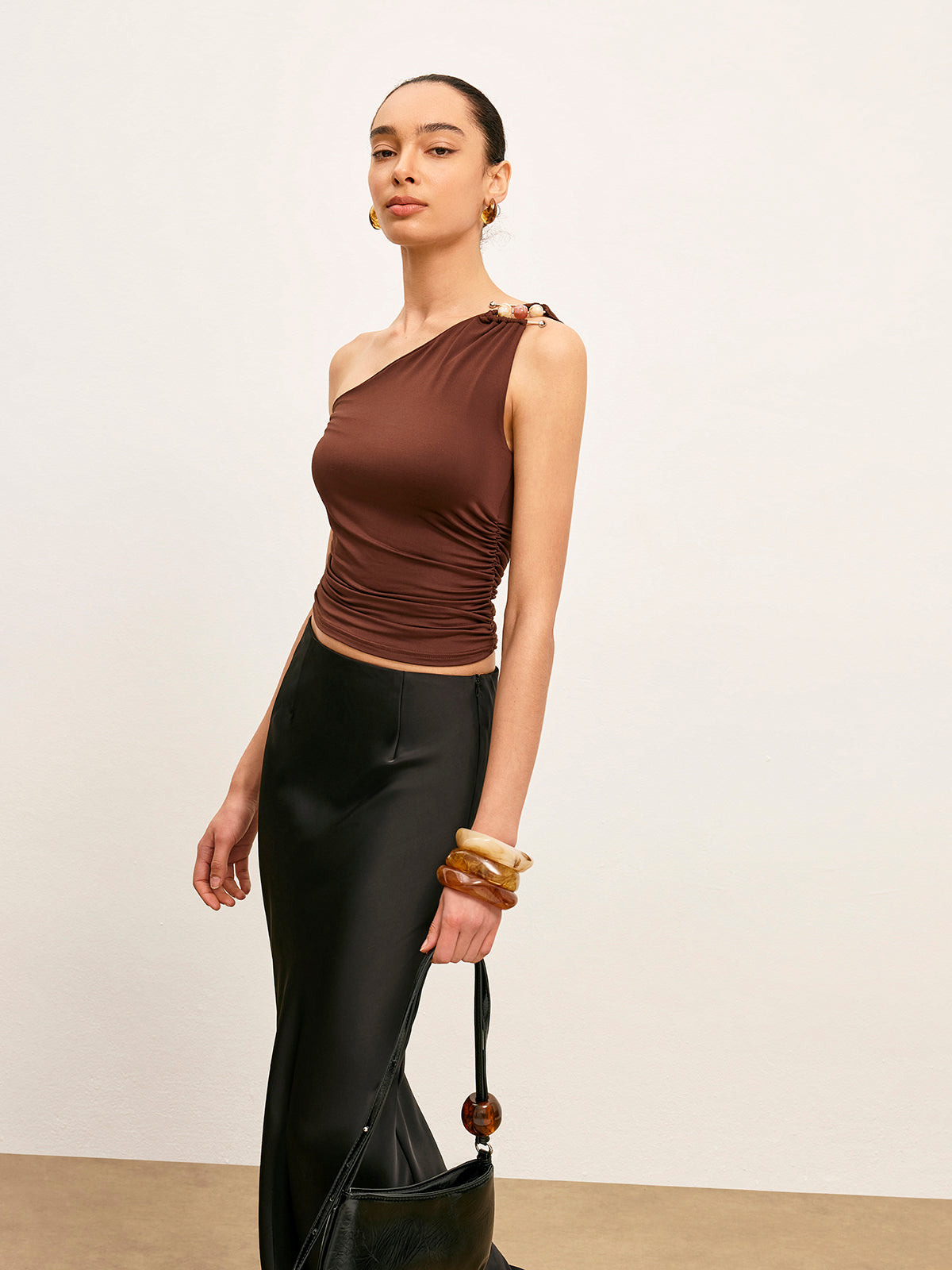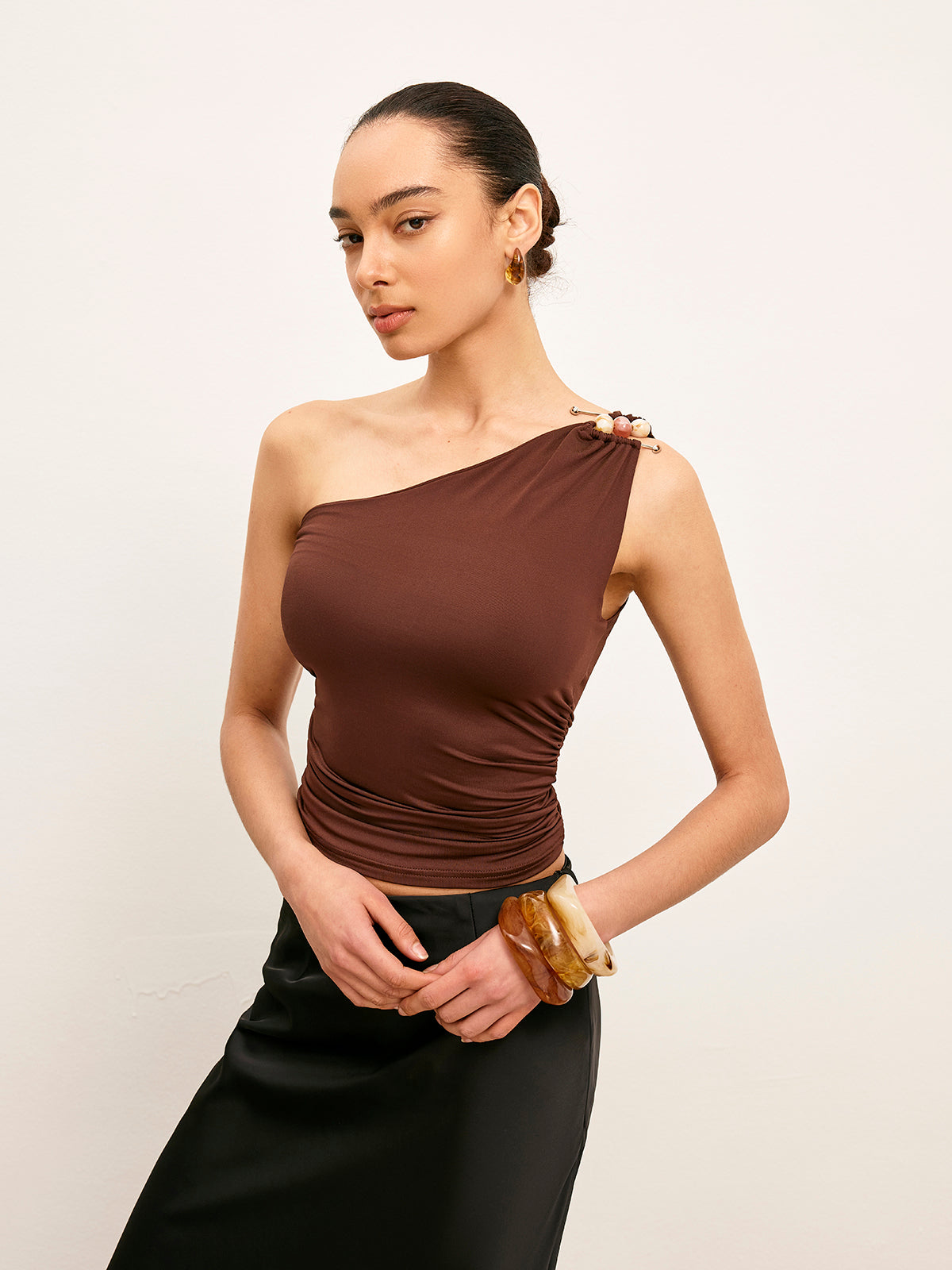Şık Tek Omuz Sıktırılmış Üst, Şık Metal Detaylarla