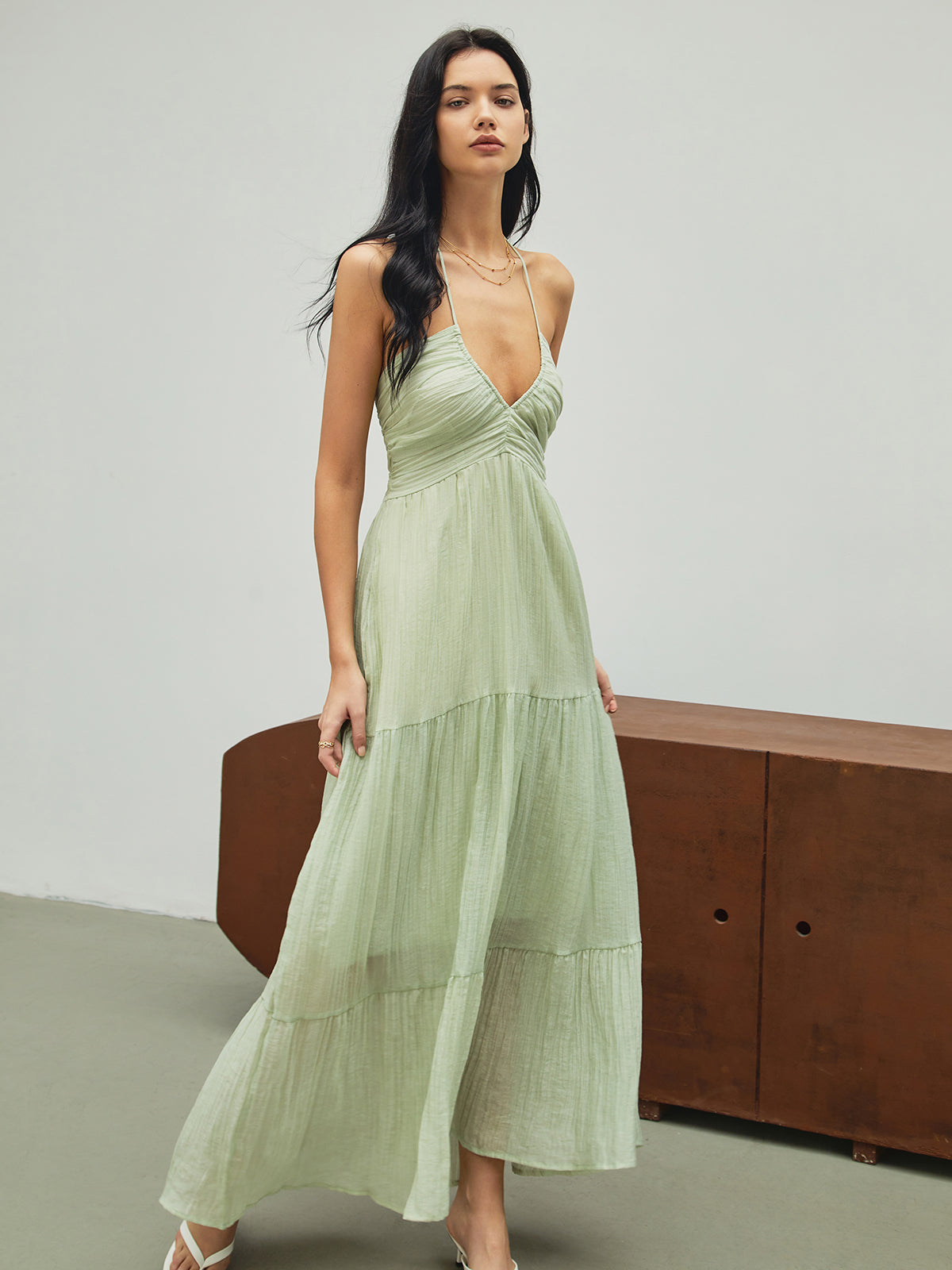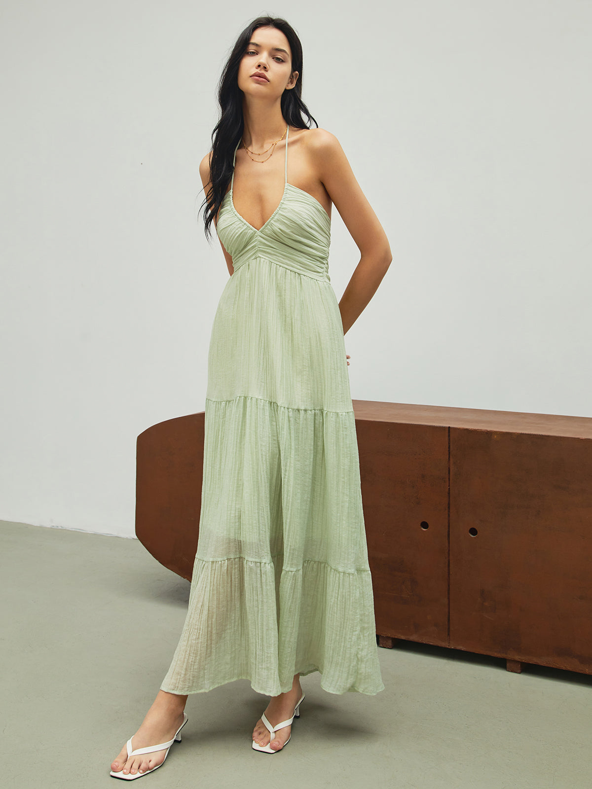Boyundan Bağlamalı Sırtı Açık Tatil Uzun Elbise