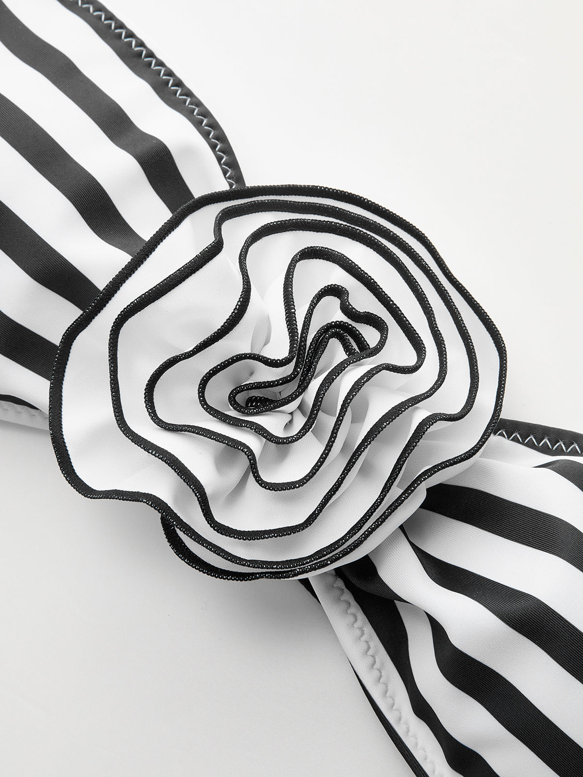 Şık Çizgili Bandeau Bikini Takımı Çiçek Aksamları ile